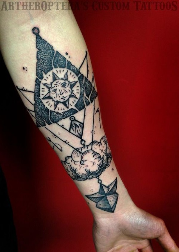 手臂令人印象深刻的黑白神秘几何纹身图案