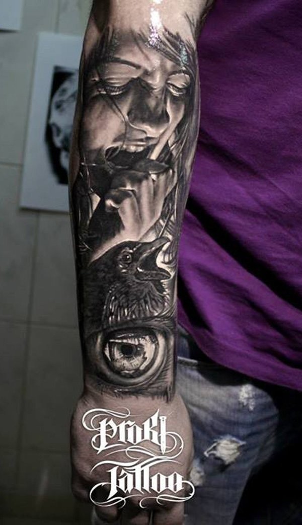 手臂非常逼真的女人肖像与眼睛乌鸦纹身图案