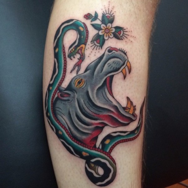 old school丰富多彩的河马头和蛇手臂纹身图案