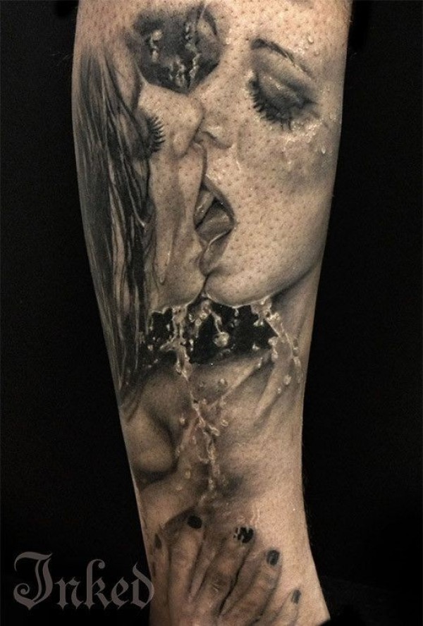 手臂黑灰性感的接吻女子肖像纹身图案