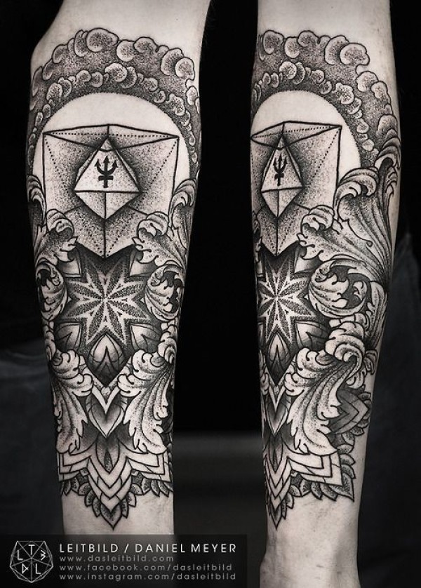 手臂点刺风格黑色的花卉与几何图形纹身图案