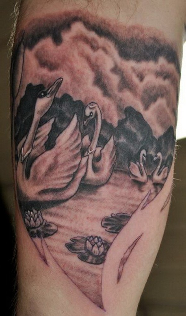 手臂湖面上的黑天鹅和白天鹅荷花纹身图案