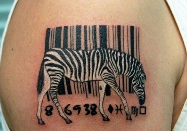 大臂一只斑马与条形码黑白纹身图案