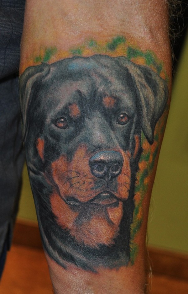 手臂绿色背景和写实的罗威纳犬纹身图案