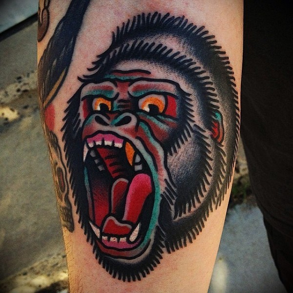 手臂愤怒的彩色大猩猩头纹身图案