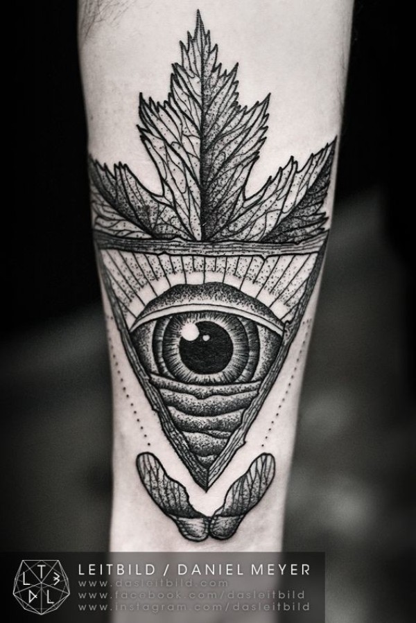 手臂神秘的黑白三角形叶子眼睛纹身图案