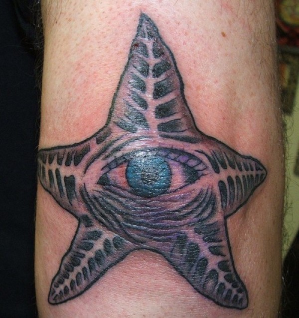 手臂可怕的黑色海星与蓝色眼睛纹身图案臂