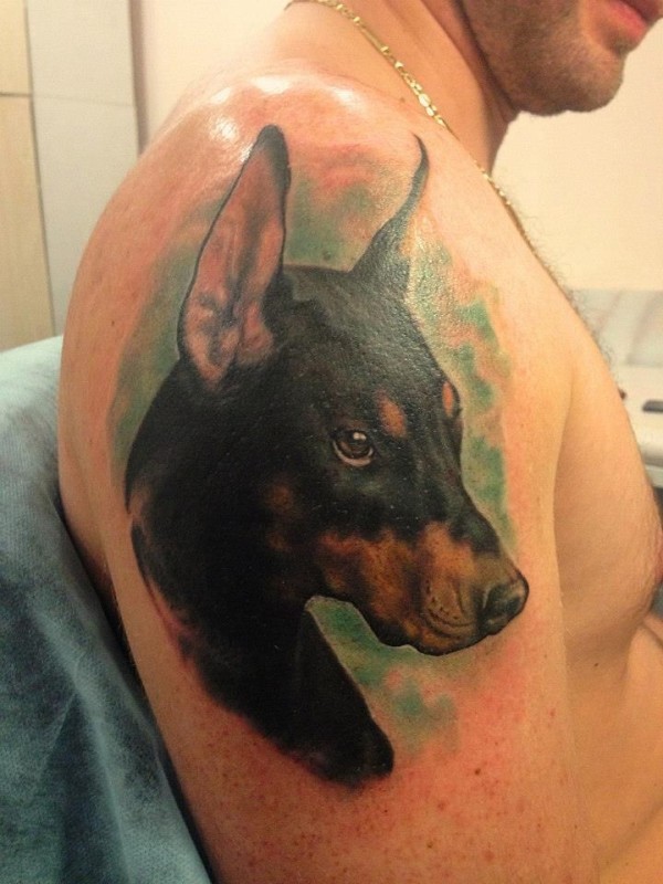 手臂严肃的五颜六色杜宾犬和绿色背景纹身图案
