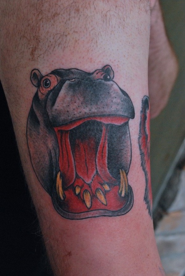 手臂巨大的彩色哭泣河马纹身图案