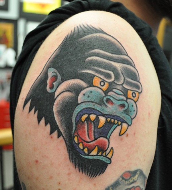 old school手臂彩色大猩猩头部纹身图案