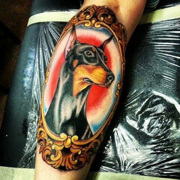 小腿,old school丰富多彩的镜框和杜宾犬纹身图案