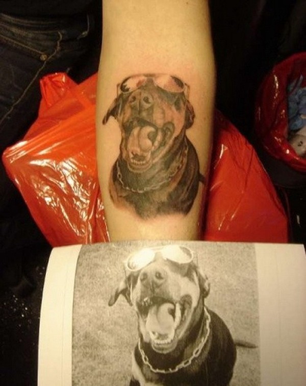 手臂可爱的灰色杜宾犬和眼镜纹身图案