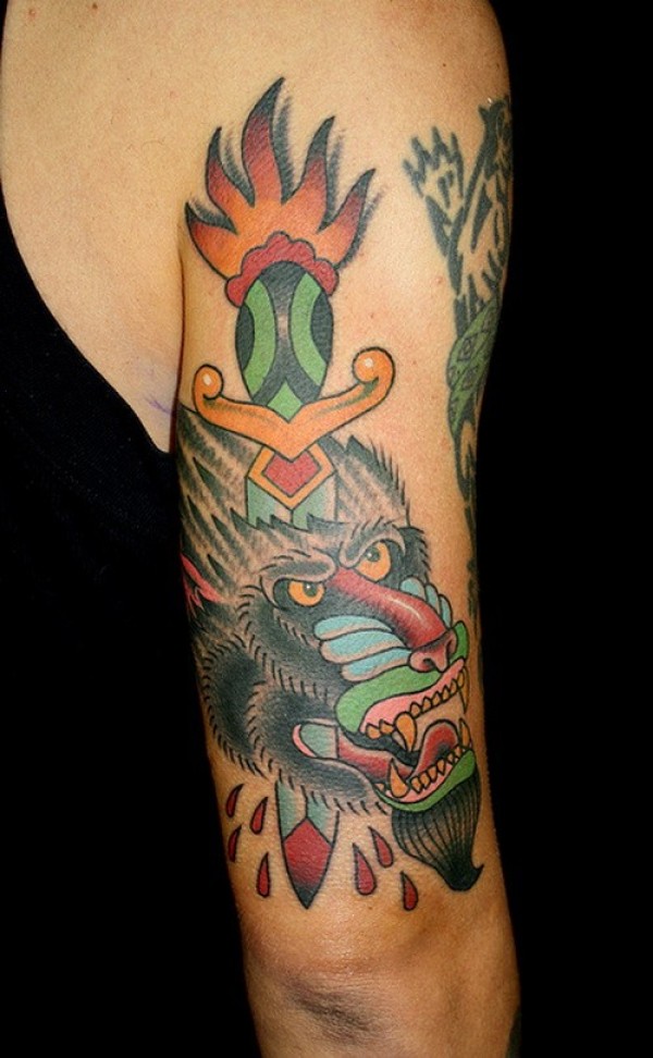 手臂可怕的彩色狒狒头和匕首纹身图案