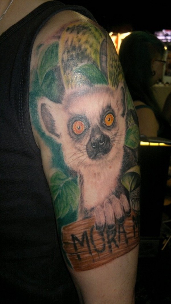 大臂很酷多彩的狐猴和热带树叶纹身图案