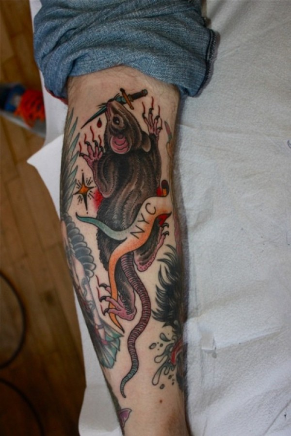 手臂丰富多彩的老鼠和匕首字母纹身图案