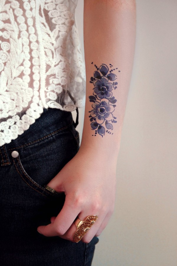 手臂可爱的蓝色复古花朵纹身图案