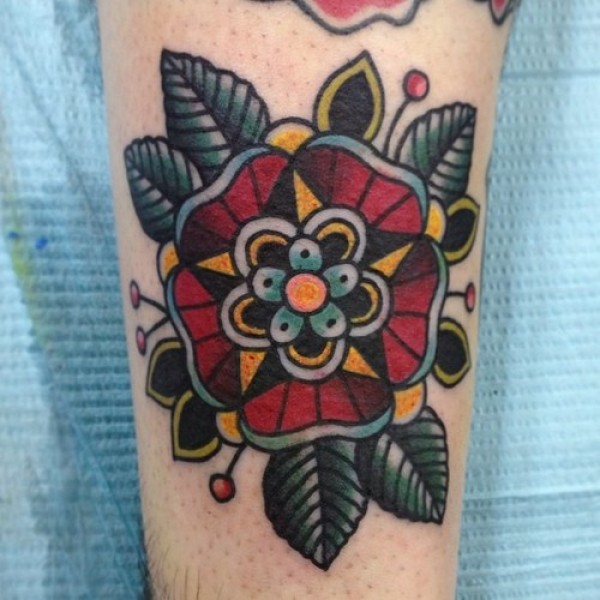 手臂传统的红色花朵和绿叶纹身图案