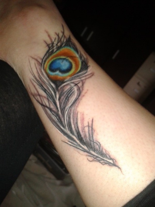 手臂彩色的写实孔雀羽毛纹身图案