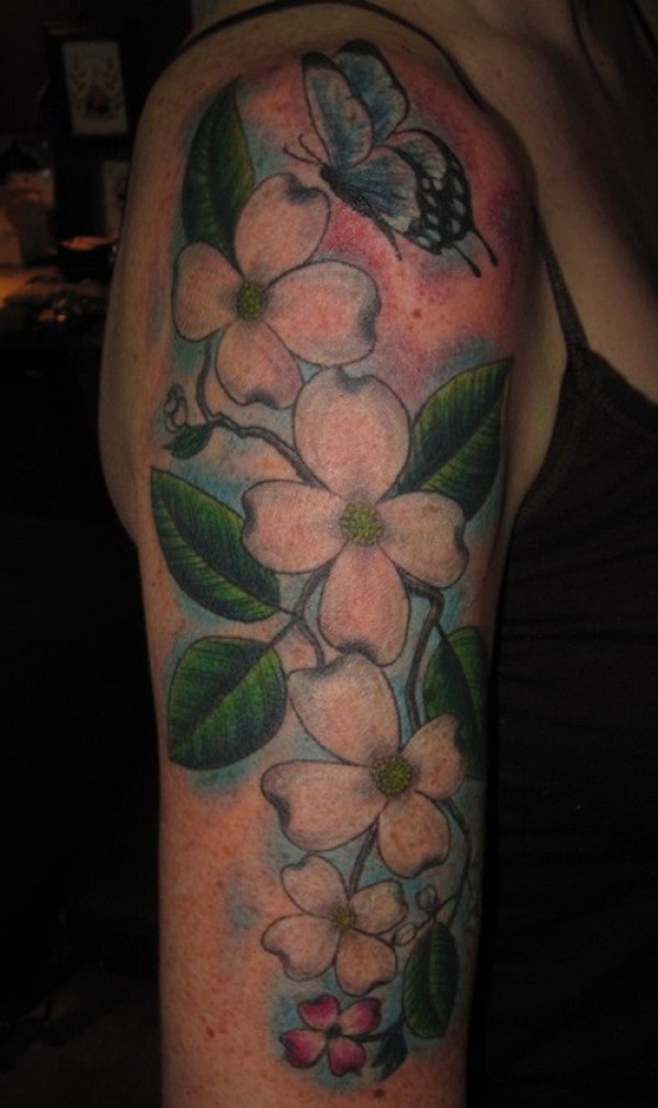 大臂白色的写实山茱萸花和蝴蝶纹身图案