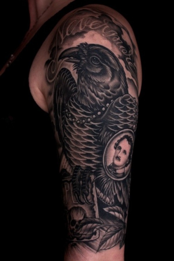 手臂上很酷的黑色乌鸦和男性肖像纹身图案