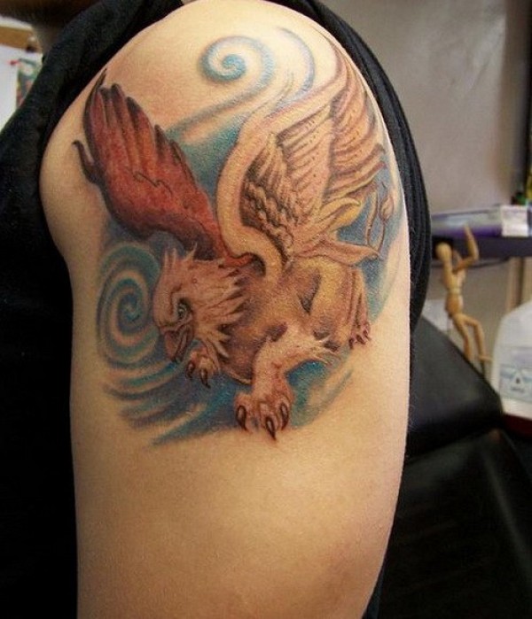 彩色的格里芬神兽和蓝色背景手臂纹身图案