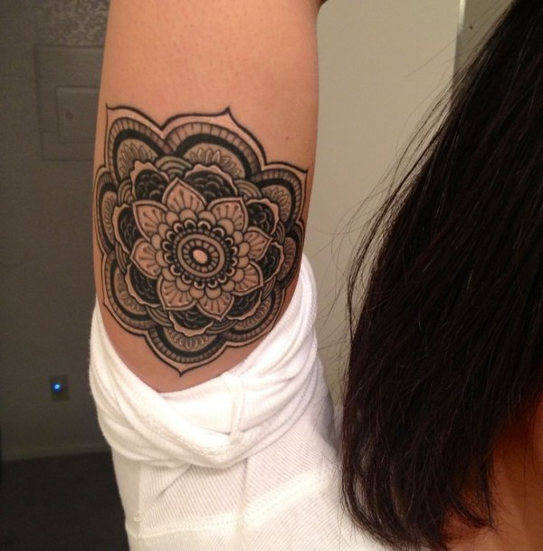 大臂内侧可爱的黑色曼陀罗花纹身图案