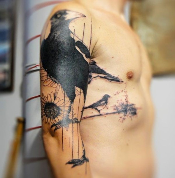 很酷的黑色乌鸦和白色花朵手臂纹身图案