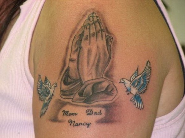 大臂可爱的白色鸽子和祈祷之手纹身图案