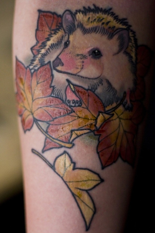 手臂可爱的小刺猬和枫叶彩色纹身图案