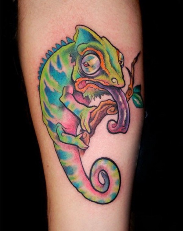 女孩胳膊很酷的鲜艳变色龙纹身图案