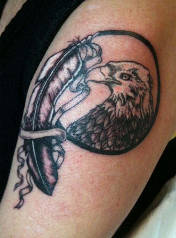 手臂很酷的黑白毛鹰和羽毛纹身图案