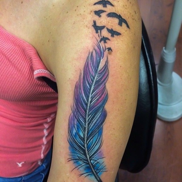 手臂上五彩的羽毛和黑色小鸟纹身图案