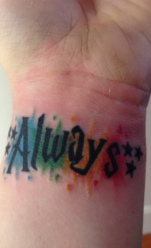 手臂多彩泼墨和黑色英文字母纹身图案
