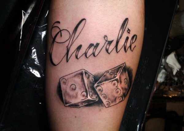 手臂上字母与骰子纹身图案