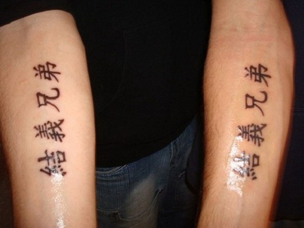 手臂兄弟之间的中国风黑色汉字纹身图案