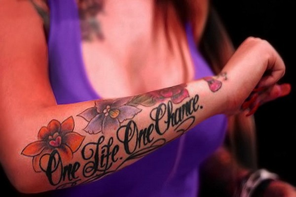 女孩子手臂五颜六色的花朵和字母纹身图案