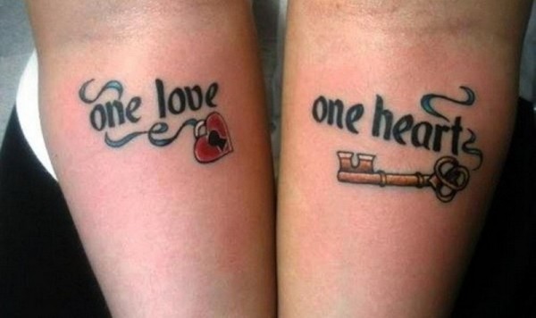 情侣手臂钥匙和心形锁英文字母纹身图案