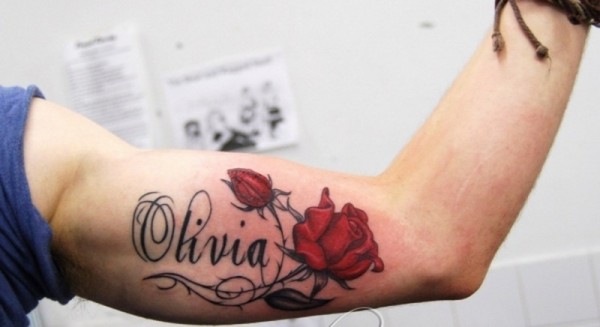 浪漫的英文名字和红玫瑰手臂纹身图案