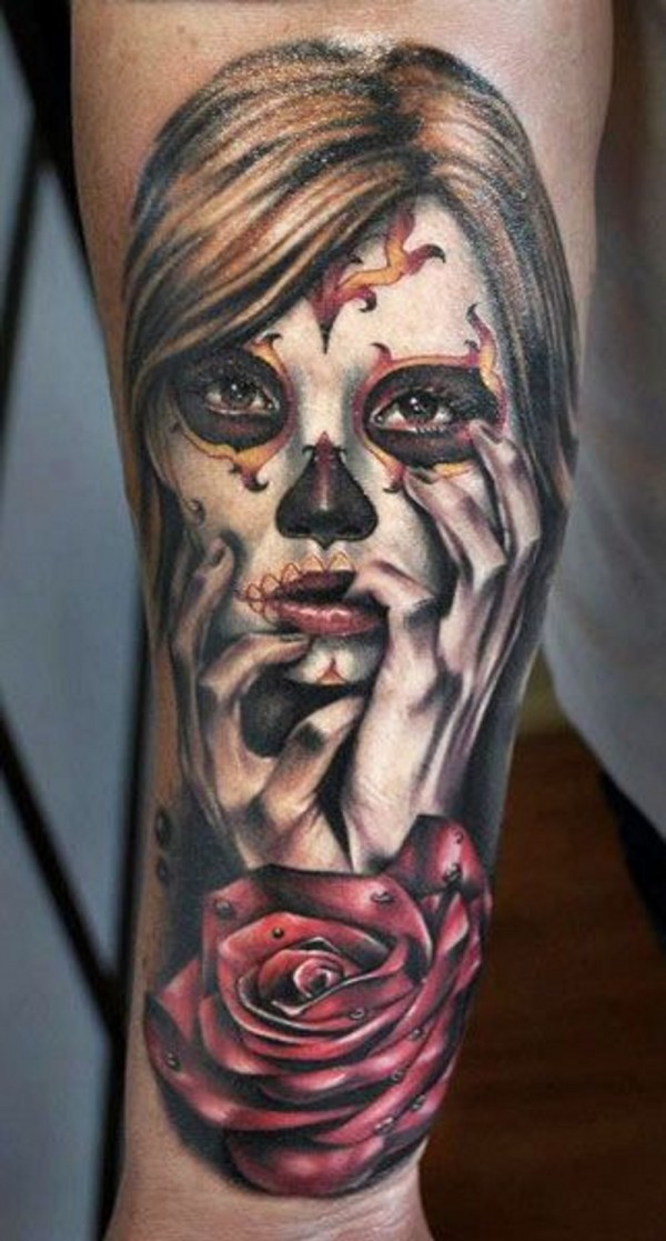 手臂忧伤的美丽死亡女郎和暗红色玫瑰纹身图案