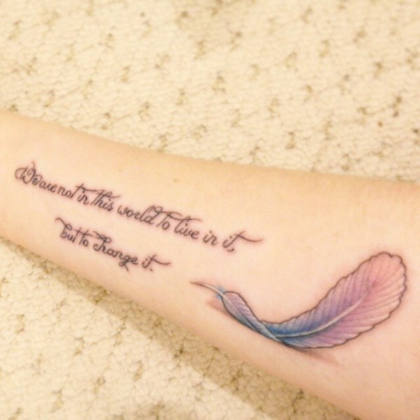 手臂粉红色卷曲的羽毛和字母纹身图案