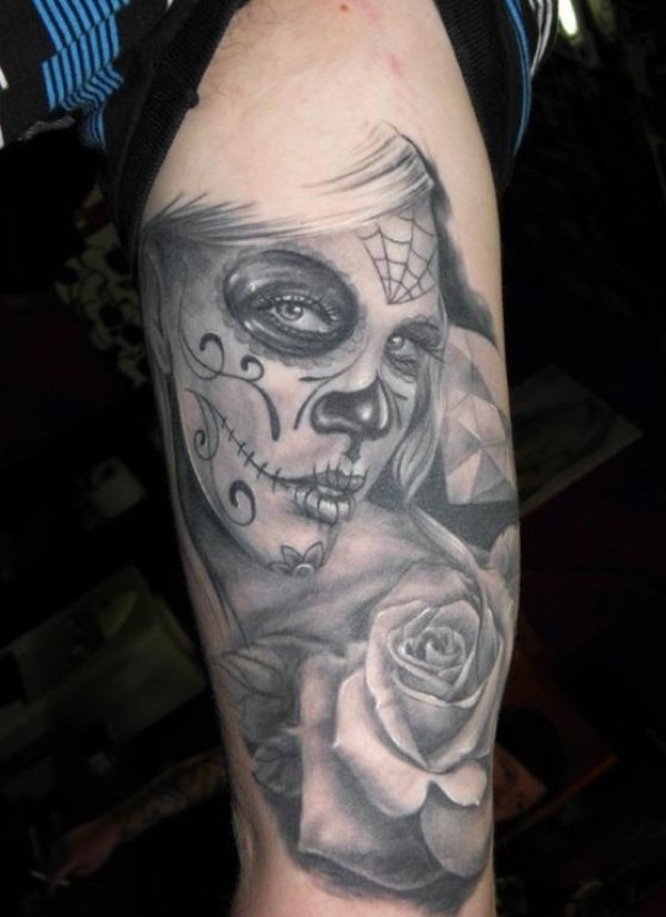 手臂上的灰色死亡女郎玫瑰纹身图案