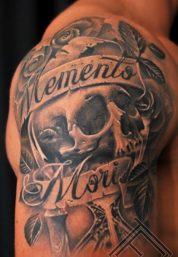 大臂死亡的象征骷髅玫瑰字母纹身图案