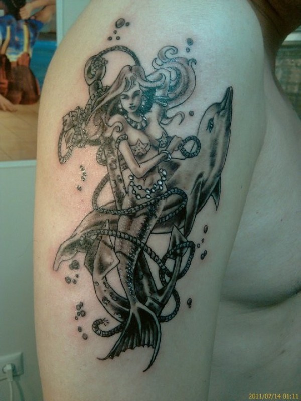 手臂上的黑灰色美人鱼海豚纹身图案