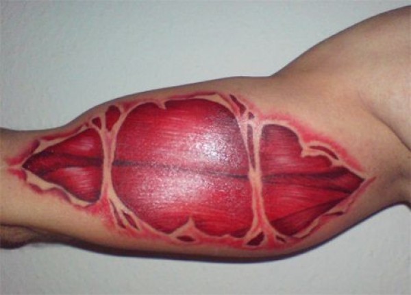 手臂上的逼真肌肉和韧带撕裂纹身图案