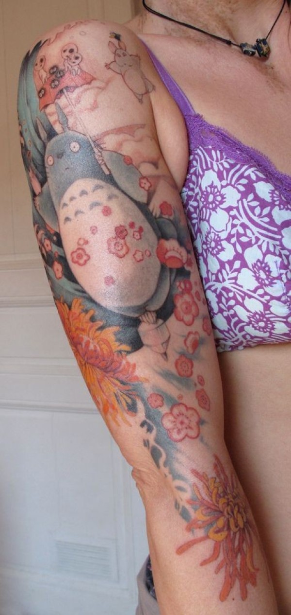 手臂彩色的卡通龙猫和樱花菊花纹身图案