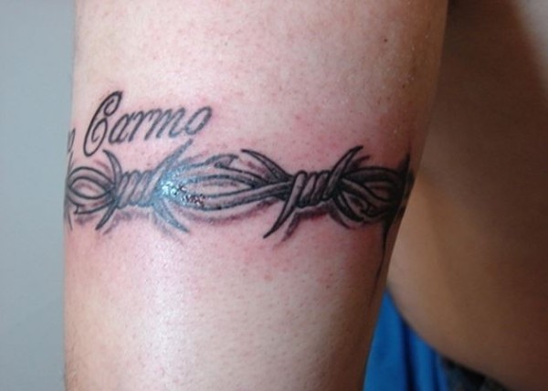 手臂上有刺的铁丝网和字母纹身图案