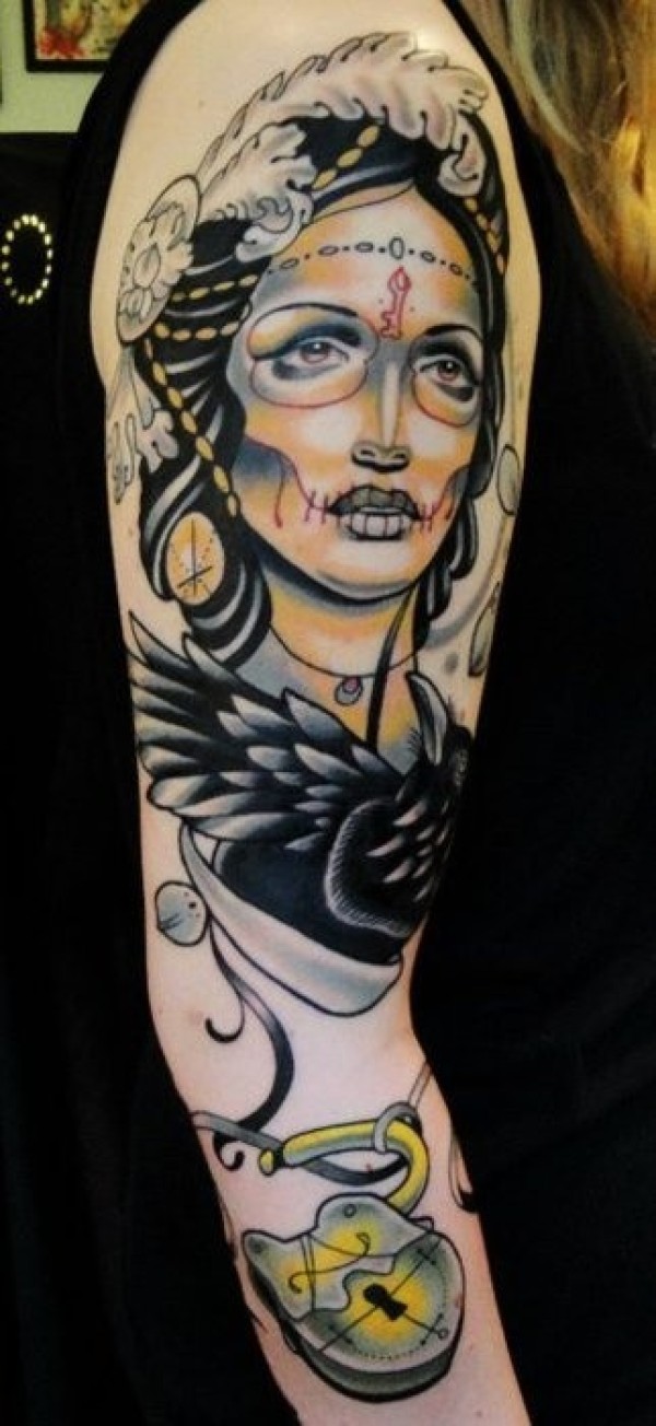 手臂死亡女郎与黑乌鸦和锁纹身图案