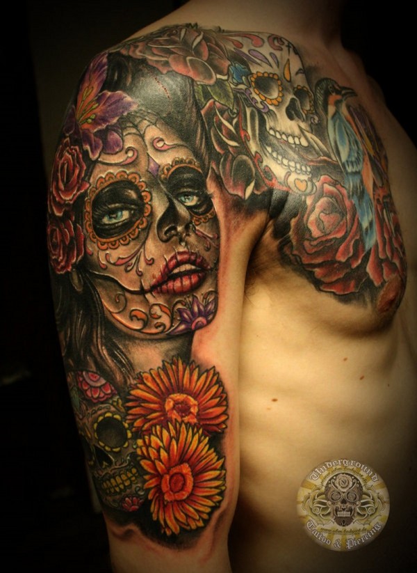 半甲墨西哥骷髅花朵和死亡女郎彩绘纹身图案