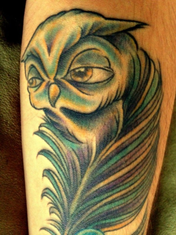 手臂上的猫头鹰羽毛纹身图案