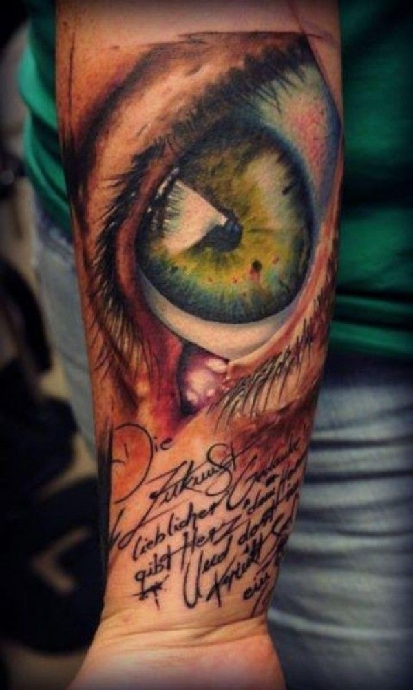 手臂非常逼真的绿色眼睛和字母纹身图案
